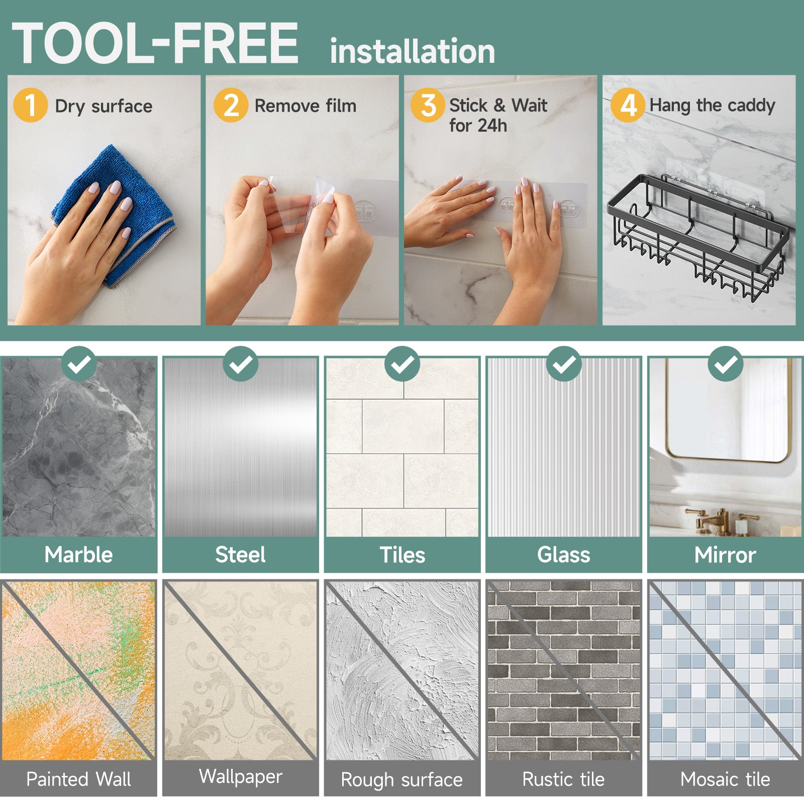 - Tool-Free Installation with Strong Adhesives- Experience an effortless setup with our Shower Caddy Set. Enjoy easy installation in 4 simple steps—no tools needed. The secret? The magic lies in our powerful adhesives, ensuring a robust and secure fit that stands the test of time.